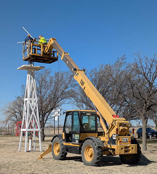 Spearville (2006) – Spearville has long been known as the Home of Windmills, an appellation that dates from the days of small windmills used to pump groundwater for irrigation and livestock. This tradition now has a new dimension with wind generation of electricity. The original wind farm grew into a sizable wind-energy complex along US 50 highway northeast of Dodge City. This region is considered to be the most windy in the contiguous (48) United States, which explains the high interest in developing additional wind power in the vicinity.