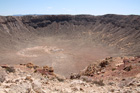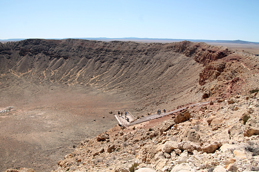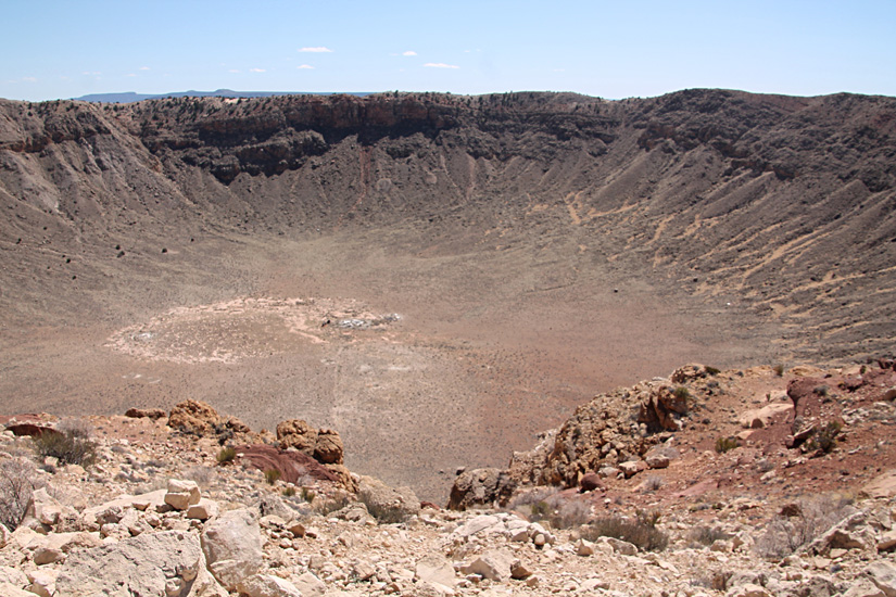 Meteorite Crater Natural Landmark, northeastern Arizona. Views from the rim showing upturned sedimentary strata of the Colorado Plateau. The crater is nearly circular and about 4000 feet (~1.2 km) across. See Meteor Crater. Photos by JSA.