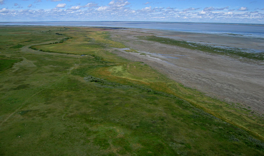 Panoramic view from Presque Isle looking toward Lake Erie in the background. The Pennsylvania mainland appears in the right distance. Kite airphoto © J.S. and S.W. Aber.