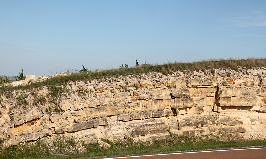 | Figure 4-1 – parallel folding. Gently bent beds of chalky limestone in the Fort Hays Limestone, upper Cretaceous, of western Kansas. Subtle folds of this type are common in areas of stable continental crust. Scale pole on right marked in feet. |