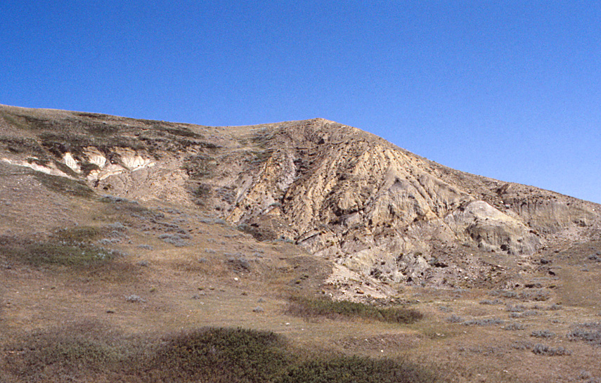 The Dirt Hills and Cactus Hills of southern Saskatchewan are among the largest ice-pushed hills in the world—see Fig. 6-5. A large natural exposure on the southern side of the Dirt Hills displays deformed bedrock of the Whitemud and lower Ravenscrag Formations—see Fig. 6-6. Lower Ravenscrag strata normally rest on top of the Whitemud Formation, but here the stratigraphy is upset. A tight fold of Whitemud strata (beds a-b) is thrust over a large, overturned fold of lower Ravenscrag sediments (beds d-j) along a thin seam of lignite (unit c).