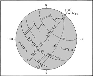 In the example (fig. 11-1), plate A is assumed to be stationary, while plate B is moving toward the southeast; according to the right-hand rule plate B is moving clockwise. For example, wAmAf, the angular velocity with respect to America of Africa, is +0.37° per million years (LePichon 1968).
