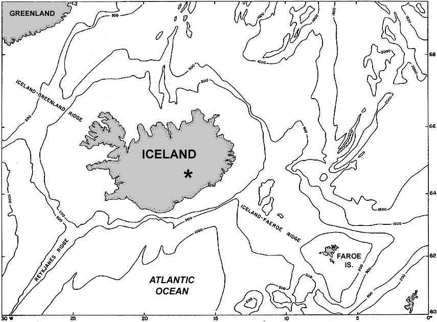 The Mid-Atlantic ridge in the vicinity of Iceland (see above) separates the North American and European plates. The American-European pole of rotation is located at 78° N, 102° E (LePichon 1968). Active seafloor spreading is taking place along the Reykjanes ridge—see Fig. 11-3. A hot spot is presently located beneath east-central Iceland at about 65° N, 17° W, as shown by high levels of volcanic and seismic activity and by a pronounced gravity anomaly.