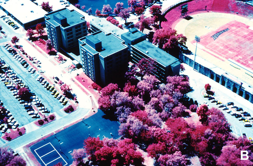 | Analog (film) photographs of the Emporia State University campus, Kansas. Color-visible (A) and color-infrared (B) show dormitory buildings, parking lots, trees, and part of the football stadium. Active vegetation appears in pink, red, and maroon colors in the CIR image. Images acquired with a dual-camera rig. |
