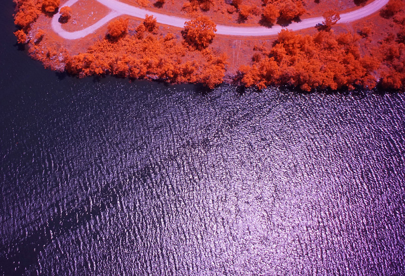 Color-infrared photos tend to enhance special lighting effects, for example sun glint and the hot spot. Sun glint is a mirror-like reflection from water bodies, metal and glass structures, etc. The hot spot is the position on the ground at the antisolar point in direct alignment with the camera and sun. It appears bright because of shadow hiding (Hapke et al. 1996).