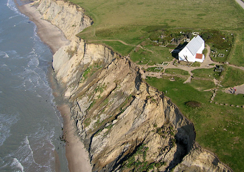 | Overview of Mårup Kirke in the foreground and Skallerup Strand community in the background. The cliff is composed entirely of unconsolidated sediments. It's retreating at an average rate of 1 m (3 feet) per year. |