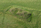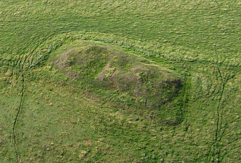 | Closer view of the main cluster of burial mounds. Sheep grazing inhibits growth of woody vegetation that would otherwise cover the protected site. Linear patterns are old field boundaries. |