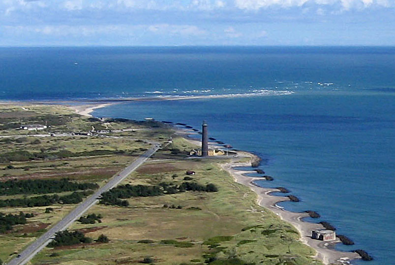 Skagen is a narrow peninsula that extends to the northeast and separates the Skaggerak from the Kattegat seas. It's a prominent navigation point for passing ships. Given its geographic importance, several generations of lighthouses have been erected beginning in the late 1700s. Skagen is a low, sandy, wind-swept landscape with long beaches and active sand dunes. It is a famous scenic and touristic locale.