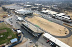 | Closeup view of the new student activity center (SAC) at scene center, far end of the football stadium. |