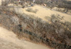 | Closeup view of Tar Creek through bare trees in winter. The reddish-brown color beneath the trees is a rust stain left by high water of Tar Creek, which drains from the Tri-State mining district. |