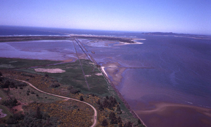 | View toward the Columbia River mouth and Pacific Ocean from Ft. Stevens State Park, Oregon. In the distant center is Clatsop Spit, and beyond that Cape Disappointment can be seen in the right background. The passage between these two landmarks connects the lower Columbia estuary (right) to the Pacific Ocean.