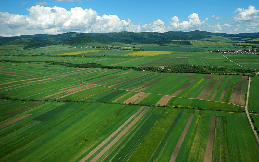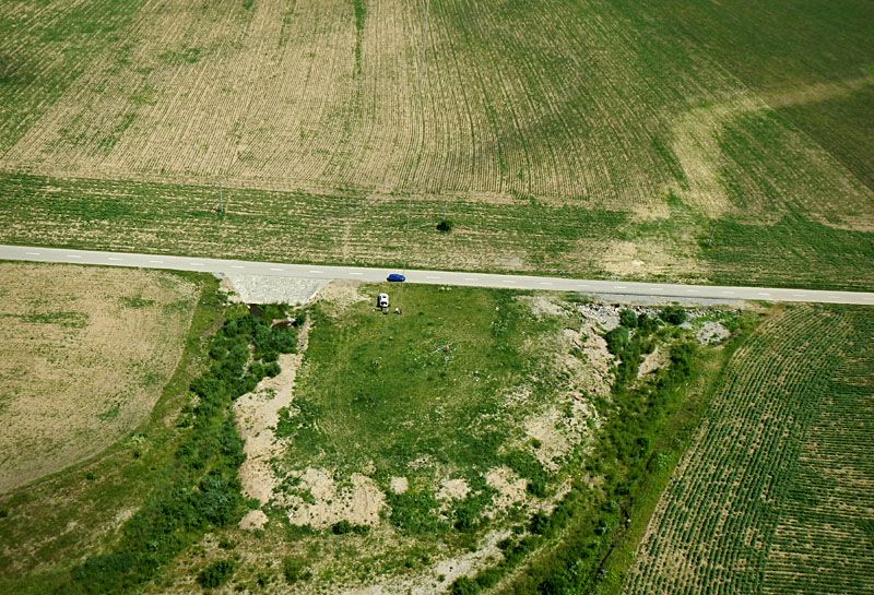 Our kite launching site was on the side of one such limestone hogback, which created a strong local updraft. Under partly cloudy conditions, our pictures are mosaicks of sunlit and cloud-shadowed patches on the ground. Beside the village of Kamenica, near Prešov.