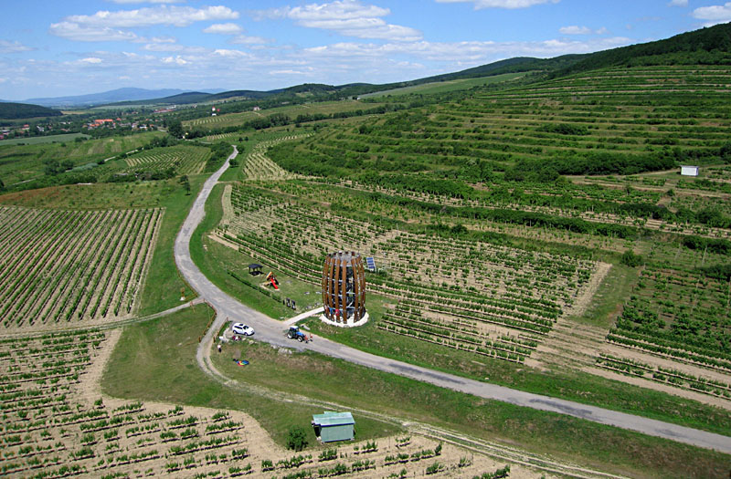 | Tokaj Viewing Tower overview (left) and close-up shot (right). The tower is a Swiss-Slovak project constructed in 2015 to resemble a traditional wine barrel. The top platform stands 12 above ground level, which allows panoramic views of surrounding hillside vineyards. |