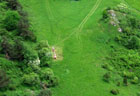 | Vineyards extend across southern slopes of the Zemplinske hills (left) near the border with Hungary. Individual fields form intricate patterns on the landscape (right). Note small tractor in lower right corner; it is pulling a sprayer between rows of grape vines. | ![]() |