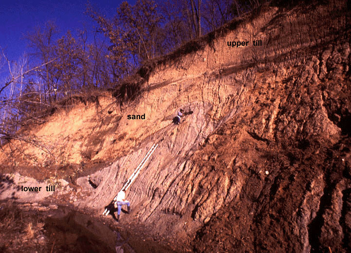 The Kansas City region was invaded by ice at least two times during the Independence glaciation. The early advance was the Minnesota ice lobe, which came through Iowa and entered the region from the northeast. This glaciation is marked by gray till that fills the preglacial valleys of the region. The Minnesota advance reached its maximum southern extent in the vicinity of Weston, Missouri and Leavenworth, Kansas (see map below).