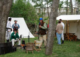 | Closeup view of the reenactment camp under cool shade trees at Kaw Point. |