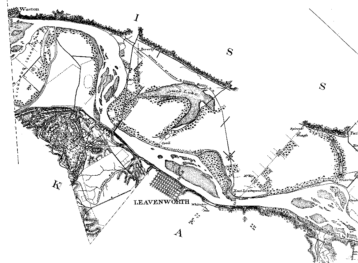 | Portion of Leavenworth, 15-minute, topographic quadrangle dating from 1910. The old Missouri River of Lewis and Clark probably followed the western margin of the valley; whereas, the old MO/KS border looped across the valley north of Kickapoo Island. Both Iatan and Weston, Missouri were founded at points where the river flowed against the valley bluffs in the early 1800s, but the river later shifted away from these towns.