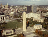 Portrait view of the Liberty Memorial with downtown Kansas City skyline in background. Uniformly sunlit scene. Blimp aerial photograph, 6/03 by J.S. Aber. |