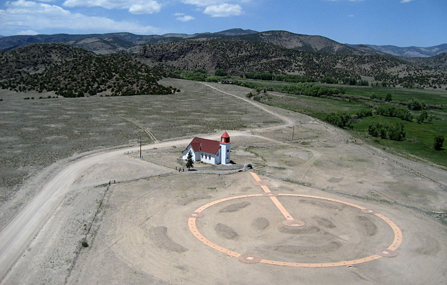 | Near-vertical shots over Stations of the Cross Shrine showing the chapel, bronze statues, and labyrinth. The shrine was created by sculptor Huberto Maestas, a San Luis native, built by volunteer labor, and dedicated in 1990. It now attracts thousands of visitors every year.