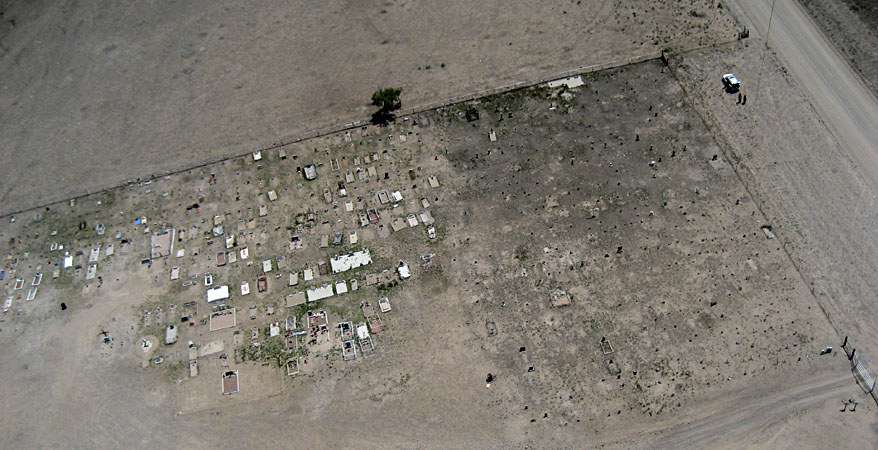 | Carnero Creek Cemetery. Left: overview of the cemetery showing clear division between the potter's field (right side) and more-elaborate graves (left side). Kite flyers in upper right corner (SWA & JSA). Right: closer view of the cemetery with potter's field in foreground.