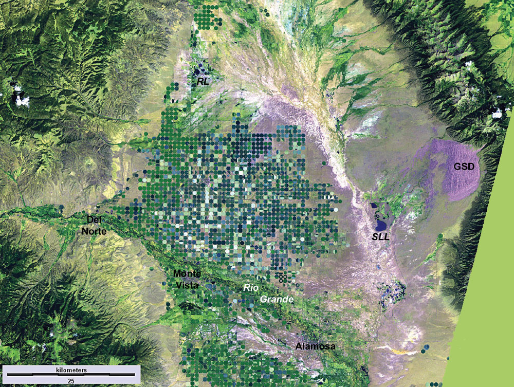 | Landsat satellite image of central San Luis Valley. The region north and east of the Río Grande is an internal basin draining into several lakes. GSD - Great Sand Dunes, RL - Russell Lakes, SLL - San Luis Lake. Active vegetation appears green. Circles represent center-pivot irrigation and most are half a mile (0.8 km) in diameter. Acquired 21 August 2009; image processing by JSA. |