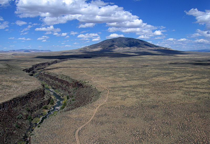 Lee Trail is the last access point on the Río Grande canyon in the San Luis Valley; the rough trail descends 215 feet (70 m) from the parking area on the plateau to the river bank below. The canyon walls here are formed in lava flows of the Servilleta Basalt, as near Ute Mountain. Eruption and growth of volcanoes near Questa, beginning about 6 million years ago and continuing to ~1 million years ago, blocked local drainage and led to a lake in Sunshine Valley between Ute and Guadalupe mountains. The lake dried up by 640,000 years ago (Machette et al. 2011). Toshiro Nagasako assisted with kite aerial photography at this site.