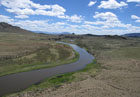 | Overviews of the Río Grande looking northward with Ute Mountain in the background. Ute Mountain is among the youngest, large volcanic features in the SLV dating from the Pliocene (Ruleman et al. 2016). The Río Grande has carved a deep canyon nearby through thick lava flows of basalt.