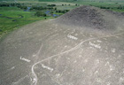 | Left: looking northward. The oval-shaped light feature in lower right is a quarry in tuff, a type of volcanic rock that was erupted along the eastern margin of the San Juan Mountains. Right: near-vertical shot showing ant hills (light patches) and animal trails. The ant hills are about 3 to 6 feet in diameter.